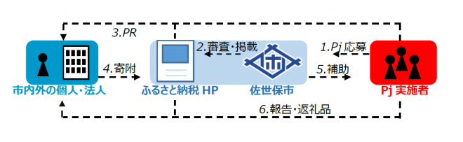 集まった寄附金に応じて、原則同額を上乗せしたものを佐世保市から補助金としてプロジェクト実施者にお渡しし、プロジェクトの実現を加速させます。