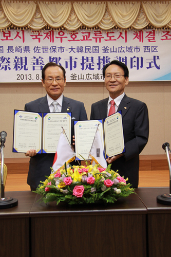 2013年8月2日(金曜日)、本市は大韓民国・釜山広域市西区と国際親善都市の締結を行いました。今回の締結は、2012年5月に西区から両都市の海や港などの共通点を生かした交流の意向が示されたことがきっかけとなったもので、相互に情報交換を行いながら親善関係を深めてきた結果、合意に至ったものです。