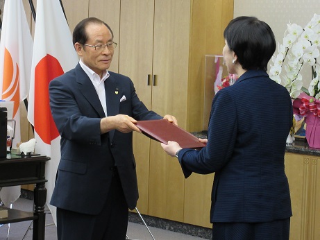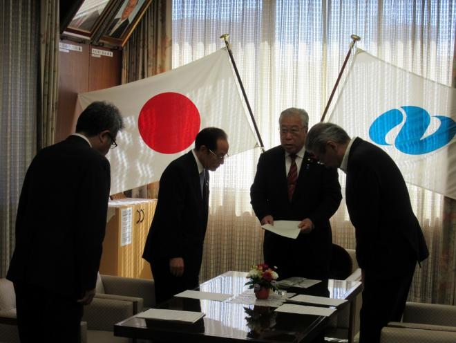 - 10月6日、朝長市長と市岡市議会議長が県庁を訪れ、長崎県知事から「中核市の指定に係る申出の同意書」の交付を受けるとともに、長崎県知事と長崎県議会議長に対しお礼を申し上げました。