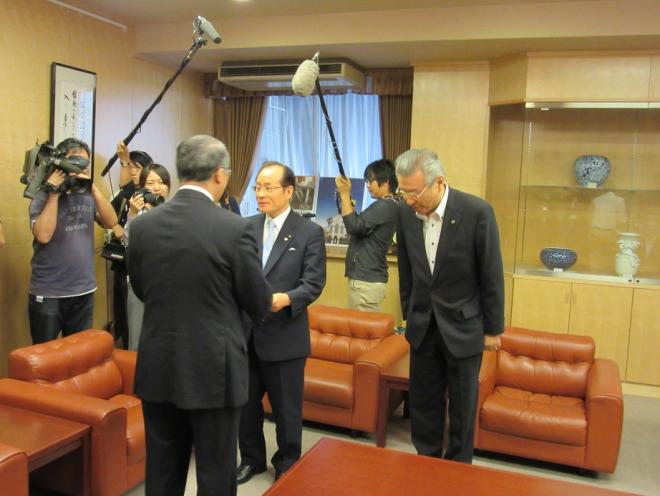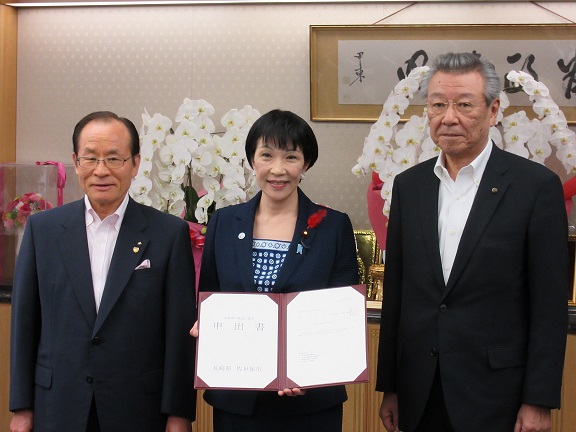 - 8月18日、朝長市長と市岡市議会議長が県庁を訪れ、市長から長崎県知事に対し、「中核市の指定の申出に係る同意申入れ」を行うとともに、長崎県議会議長には同意申入れの報告と支援をお願いしました。