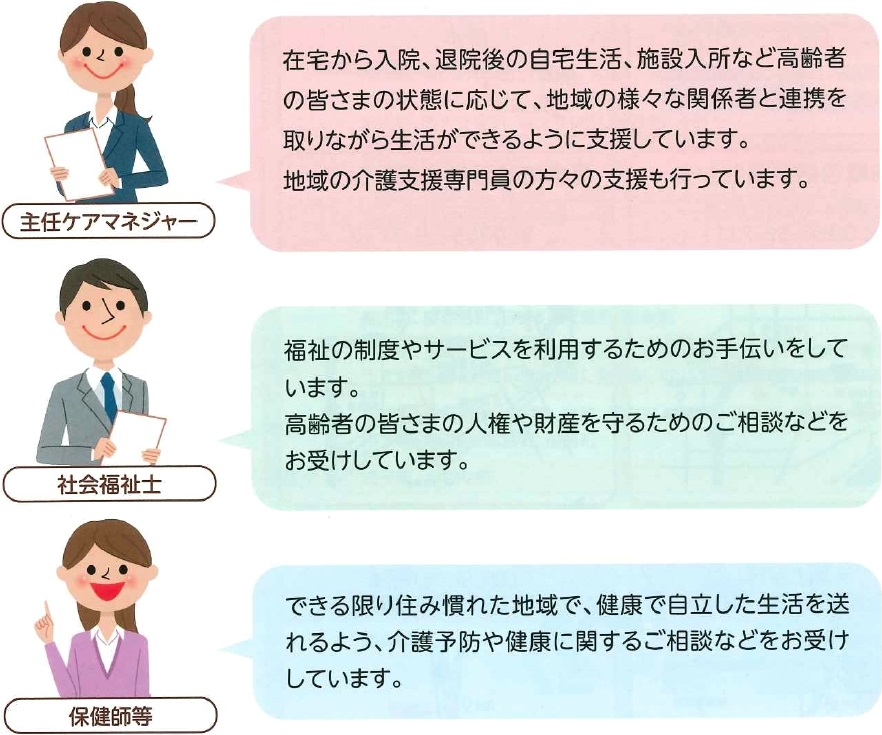 担当する職員は、主任ケアマネジャー、社会福祉士、保健師等の専門職で、地域の皆さまの健康、生活、財産、権利などを守るために、お互いが連携を取りながら必要な支援を行います。