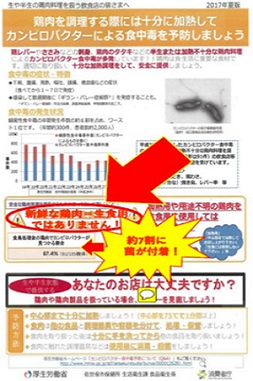 飲食店等で発生したカンピロバクター食中毒の約半数の事例では、仕入れ品に加熱用表示があるにもかかわらず、生又は加熱不十分な鶏肉を客に提供していたことが判明しています。