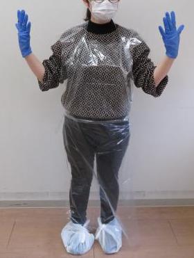 1.前の項目で作ったエプロン・マスク・手袋(2重)を身に着け、フットカバー代わりのポリ袋に足を入れて持ち手の部分を足首で結びます。