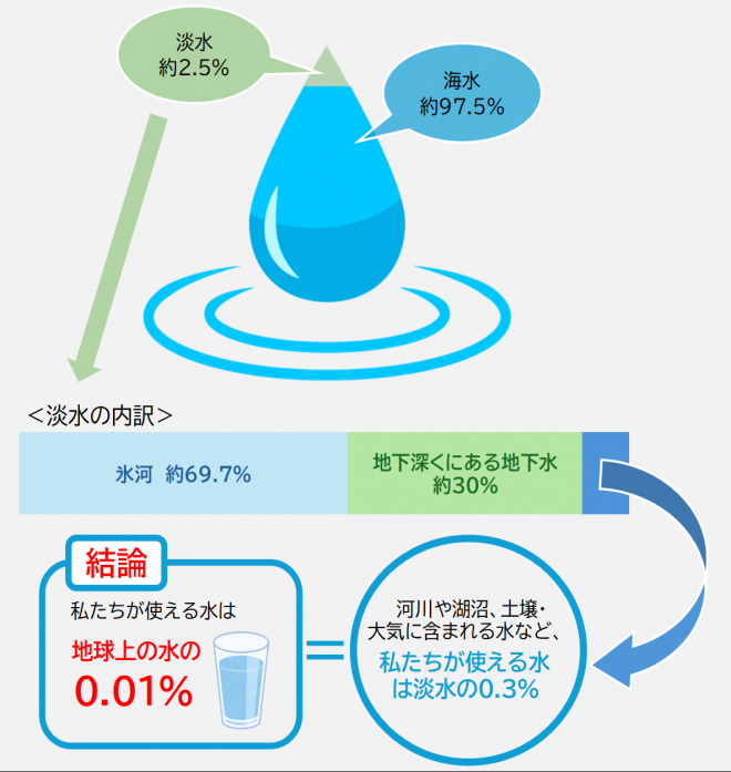 地球上には、13億8,600万立方キロメートルの水があります。そのうち約2.5%が淡水で、ほとんどが南極や北極の氷山や地下深くにある地下水になり、私たちが使える水は地球上の水のたった0.01%しかないのです。