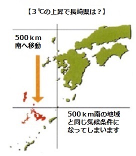 もし、佐世保で3℃も気温が上昇すると、温暖な気候の佐世保は奄美大島と同じ亜熱帯気候になってしまいます。農作業や漁業などに多大な影響があるかも知れません。