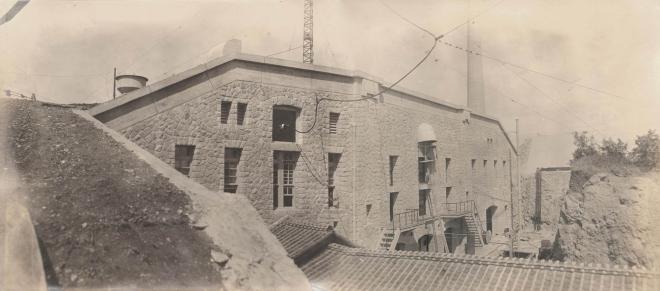 竣工时电信室的正面构造如图2所示。照片3为当初施工时的照片,可以看到入口位于楼梯尽头的二楼。照片4显示的是建设电信室时的场景,拱形的屋顶结构已经成形。在这上面铺设沙土和砂砾,构成可以吸收爆炸冲击的耐爆结构。