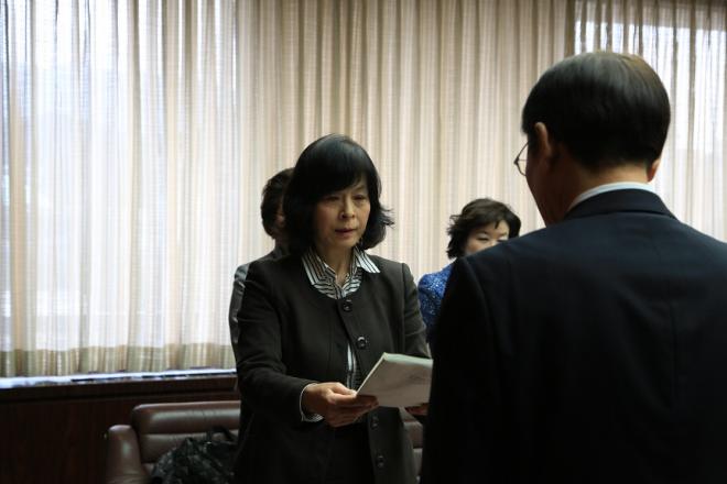 「佐世保市子ども・子育て会議」の豊島会長から朝長市長に対して、佐世保市子ども・子育て支援事業計画の策定に関して、「答申書」と「新させぼっ子未来プラン(案)」が手渡されました。