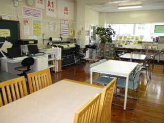 印刷機・コピー機・紙折機を設置しておりチラシや資料作成の作業スペースとして利用できます。