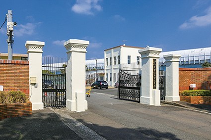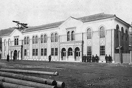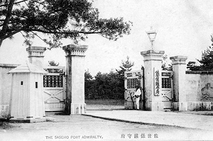 鎮守府の顔ともいえる表門の写真。当時は門柱上部にガス灯と思われる照明器具が取り付けられており、その後何度も化粧直しが行われました。現在も海上自衛隊佐世保地方総監部の正門となっており、昔と同じ面影を残しています。昭和20年6月の佐世保空襲によって庁舎をはじめ多くの建物が失われましたが、表門は開庁当時のまま残されています。昭和43年に海上自衛隊佐世保地方総監部が移転し、現在も国土防衛の要としての役割を担い続けています。