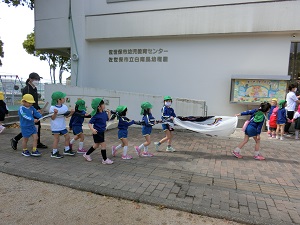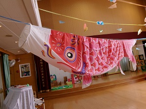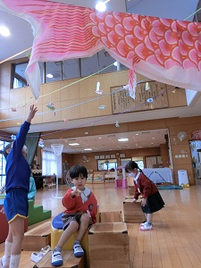 白南風幼稚園にもこいのぼりを飾ろう!と、準備していたところ、パラパラと小雨が降ってきました…外は無理でも部屋の中なら大丈夫じゃない!?という子どもたちの声があり、こいのぼりの歌を歌いながら、遊戯室に飾りました。このチャンスを逃すまいと、普段は届かないところにあるこいのぼりに手を伸ばします。どうしても触りたくて、積み木まで持ってくる子どもたちでした。