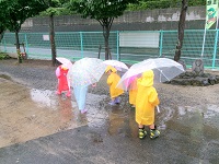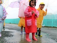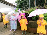 梅雨らしい天気が続いていた日のことです。ある子が「傘さして散歩に行きたいよ~」と言い出しました。『傘』『カッパ』『長靴』の、良い子の三点セットの準備ができたら出発です!