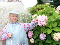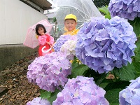 雨の日が好きな生き物って何?と尋ねると、「カエル!」「カタツムリ!」「ナメクジ!」と返ってきました。残念ながら、子どもたちが挙げた生き物を見つけることはできませんでしたが、アジサイがきれいに咲いていたので記念撮影。