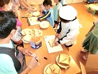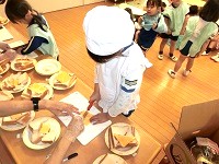 手洗いを済ませて、エプロンに着替えたらサンドイッチパーティーの始まりです。まずは食パンを包丁でカットします。三角サンドイッチ、四角サンドイッチも自分たちのお好みで。