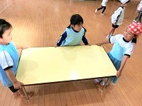 先生に付き添ってもらいながらクッキングは進みます。ちょうどいい大きさにカットしたり、たまごの殻をむいたりして材料の準備は完成です。続いて、パーティー会場の設営です。「まーるくなるようにテーブルを並べようよ!」「いや、一列がいいよ!」「テラスで食べるのは?」いろんな意見が出ましたが、遊戯室に丸く並べることになりました。ということで、友達と力を合わせてテーブルを運びます。