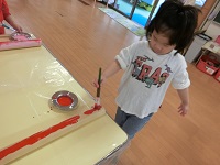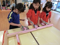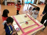 まずは鳥居の製作にとりかかります。「色は何色にしようか?」と尋ねると、「赤がいい!」「ピンクにしたい!」とうことで、絵の具を準備して塗り始めます。