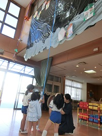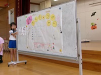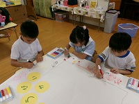 白南風幼稚園では、毎月末にその月に生まれた友達の誕生会を開催しています。今年度の誕生会は、主として年長かがやき組の子どもたちが企画、運営を担当しています。毎月、子どもたちが必要な係を考え、それぞれがアイディアを出しながら進めているところです。