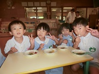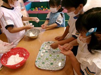 「私もした~い!」「コロコロする!!」と、係以外の子どもたちも寄ってきました。小さい友達がのどに詰まらせないようにと、ちょうどいい大きさを考えながら丸めていましたよ。