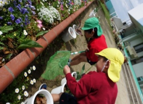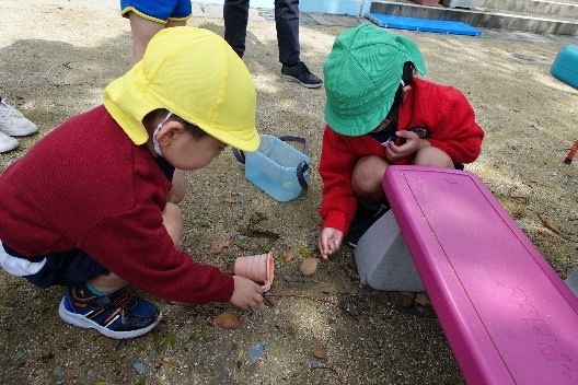 ある日、お菓子の空き箱にダンゴムシがうじゃうじゃと・・・。いろいろな場所から集めてきた様子。降園の時間になると、元気がないダンゴムシを見て、悲しそうな表情を浮かべる子ども達。次の日、虫かごを用意し、「ダンゴムシはどうしたら元気でいてくれるのかな?」と伝えると、子ども達は「葉っぱ集めてくる!」「ダンゴムシ捕まえてくる!」「土が好きなのかな?」と協力し合い、立派なダンゴムシの家を作ってくれました。てんとう虫や蝶々などいろいろな生き物に出会っては、捕まえてみようと挑戦し、図鑑を見ながら観察しています。新しいクラスになり、新たな仲間も迎えてくれているようです♪