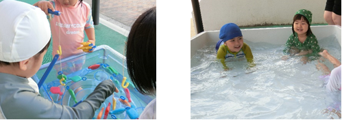 最初は顔に水がかかることを嫌がる子もいましたが、先生や友達が水浸しになって遊ぶ姿を見たり、顔に水がかからない場所で遊んだりするうちに、子ども自身が「これくらいなら大丈夫!」というところを見つけ、終業式を迎えるころには、思い切り水を掛け合って遊ぶようになりました。