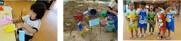 先日、幼稚園のみんなに見守られて高くあがった白南風幼稚園のこいのぼりでしたが、その後もこいのぼりブームは続きました。園庭に落ちていた小枝に「こいのぼりをくっつけたい!」と言い出した年中(4歳児)さん。好きな色の折り紙でミニこいのぼりを作り、それぞれが厳選した小枝にくっつけて出来上がり♪砂場遊びにも連れて行くほどの気に入りようでした。