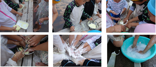 …と、色々な意見が出てきました。幼稚園にあるもので何とかならないかと考えた結果、石鹸と水で何とかなるのでは?…ということになり、早速、石鹸をゴリゴリ削り始めました。それぞれで削っていた石鹸の粉がある程度の量になってきた頃、「ねぇ~!みんなの石鹸集めてみようよ♪」という声があがりました。「さんせ~い!!」みんなで削った石鹸の粉が一つのボールに集まります。
