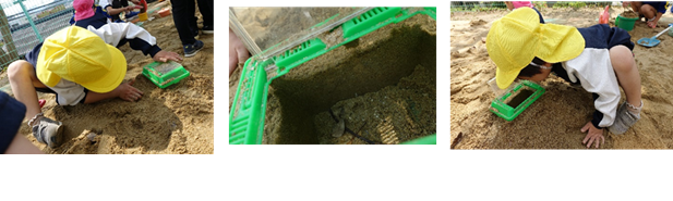 さて、子どもたちが移動した先は園庭の砂場です。ダンゴムシが入った虫かごを、砂場に掘った穴の中に埋めている年中(4歳児)さん。一体なぜ!?