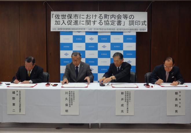 町内会等への加入促進の取り組みとして、公益社団法人長崎県宅地建物取引業協会佐世保支部(以下「宅建協会」)、公益社団法人全日本不動産協会長崎県本部(以下「不動産協会」)、佐世保市連合町内連絡協議会(以下「市町連」)、佐世保市の4者で、平成28年11月22日に、「佐世保市における町内会等の加入促進に関する協定書」調印式を行いました。