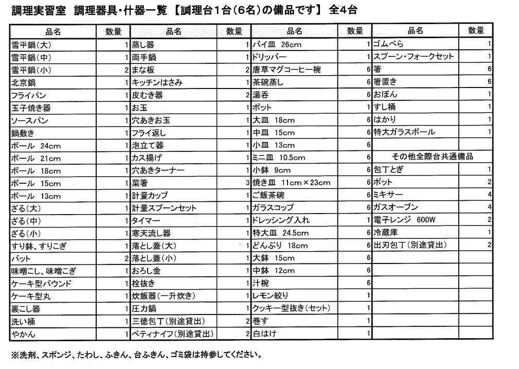 和食、洋食、デザートなど様々な料理実習ができます。 (調理台4台) |