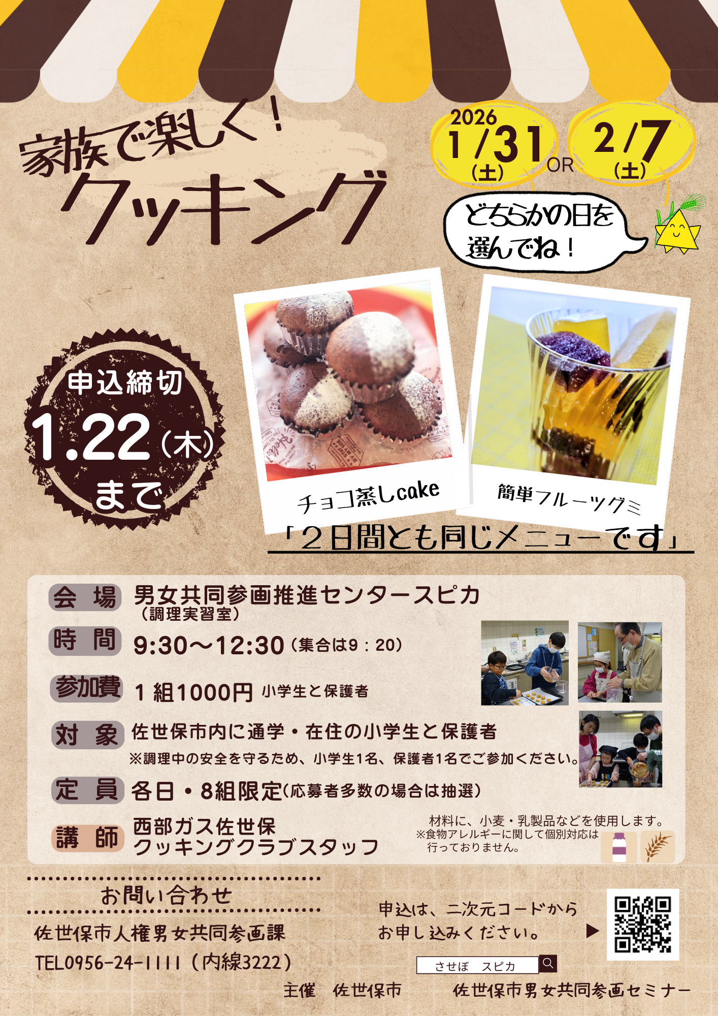 下記の関連資料の『家族で楽しくクッキング申込』からお申込みいただくか、人権男女共同参画課へ直接お電話(0956-24-1111)でお申し込みください。