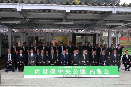<3月30日> 令和4年4月1日からリニューアルオープンする佐世保中央公園の内覧会に出席し、関係者の皆さんと記念撮影をする市長 |