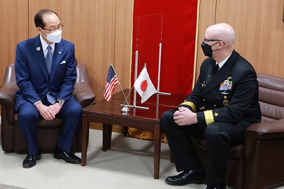 | <3月30日> 米海軍佐世保基地訪問に伴い、表敬のため市役所を訪れた在日米海軍司令官カール・A・ラティ少将と市長 |