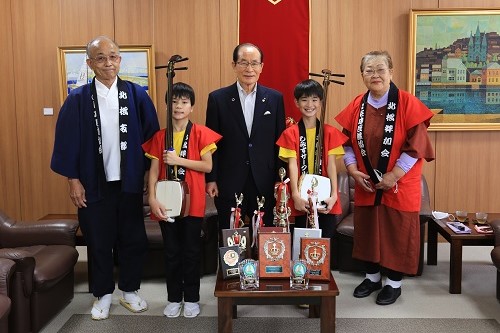 8月7日に民謡民舞少年少女全国大会に出場したことを報告するため、市役所を訪れた田中統我さん、本木秀弥さんと記念撮影をする市長