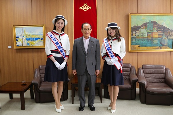 第6期「させぼ観光大使」就任に伴い、あいさつをするため市役所を訪れた大川紗和子さん、冨川佳恋さんと記念撮影をする市長