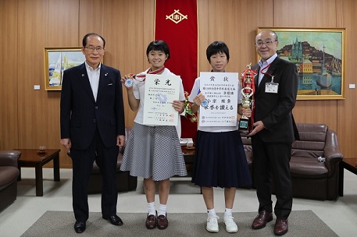 8月に行われた全国中学校体育大会に出場したことを報告するため、市役所を訪れた川上めいさん、小宗紘奈さんと市長