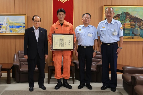 第50回全国消防救助技術大会に出場したことを報告するため、市役所を訪れた中央消防署の前川湧次郎さん、関係者と市長