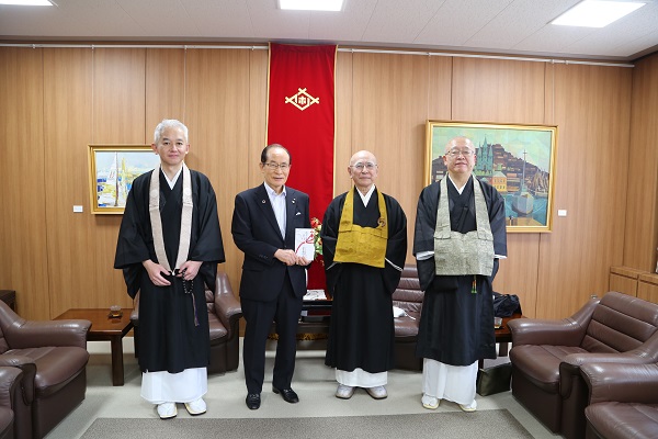 図書購入費を図書館へ寄付するため、市役所を訪れた佐世保佛教連合会の皆さんと市長
