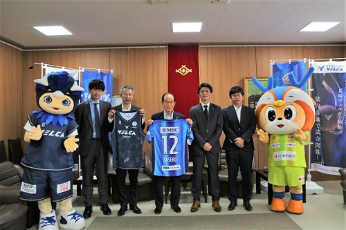 9月24日に行われるサンクスマッチと、2022-23シーズン開幕に向けてのあいさつのため市役所を訪れたV・ファーレン長崎と長崎ヴェルカの関係者と記念撮影をする市長