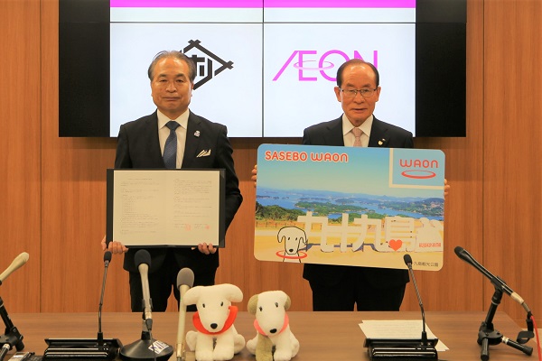 佐世保市とイオン株式会社との「包括連携協定」締結式でイオン九州株式会社代表取締役の柴田社長と記念撮影をする市長