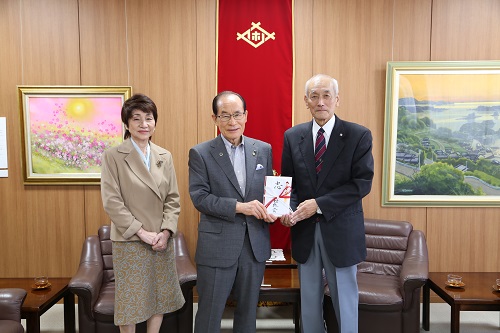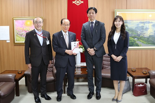 図書購入費を図書館へ寄付するため、市役所を訪れた第一生命労働組合長崎支部の皆さんと市長