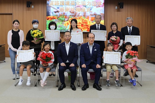 道路環境美化に関する事業(させぼ美し化プロジェクト)に協力していただいている7団体へ感謝状を贈呈し、記念撮影をする市長