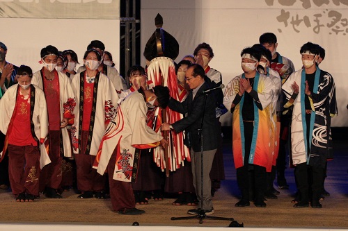 第24回YOSAKOIさせぼ祭りで大賞に選ばれた「肥後真狗舞~九州がっ祭~」へまといを贈呈する市長