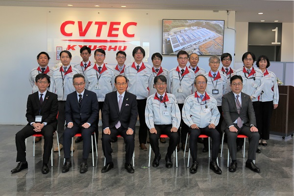 株式会社シーヴイテック九州の太陽光発電設備起動式で関係者のみなさんと記念撮影をする市長