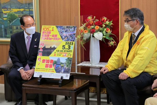 佐世保-島原ウルトラウォークラリーの開催に向けてあいさつに訪れた実行委員長と市長