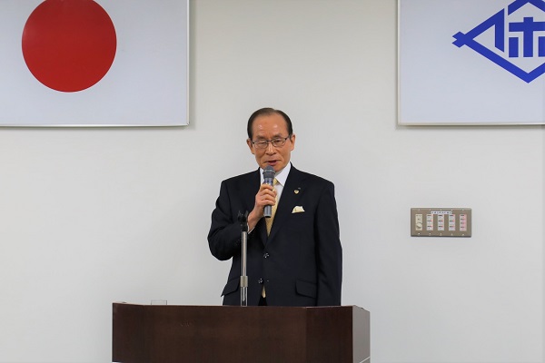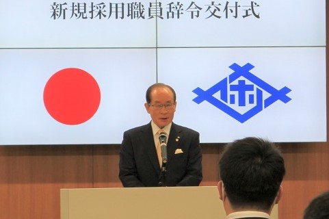 新規採用職員辞令交付式であいさつをする市長
