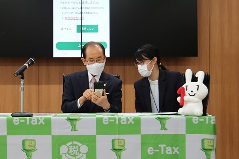 スマートフォンとマイナンバーカードを使用した確定申告書の作成およびe-Taxでの電子送信の模擬体験を行う市長