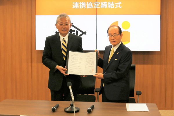 事務の効率化および生産性向上を図ることを目的とし、株式会社ガバメイツとの連携協定締結式で代表取締役と記念撮影をする市長