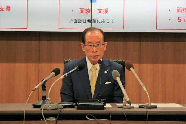 定例記者会見で記者からの質問に答える市長