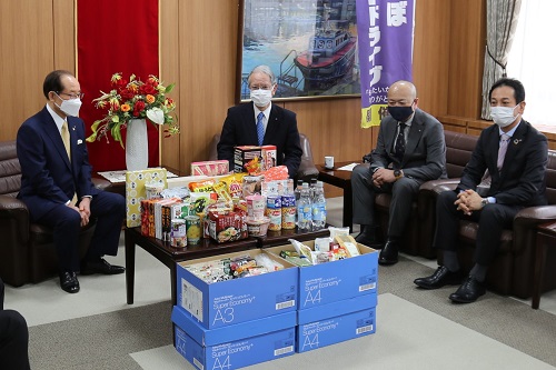 顧客や従業員などから食品を回収し、集められた食品を市へ寄贈するフードドライブ贈呈式を行うため市役所を訪れた関係者の皆さんと市長