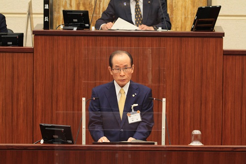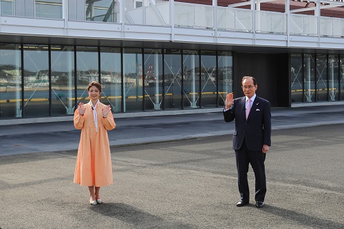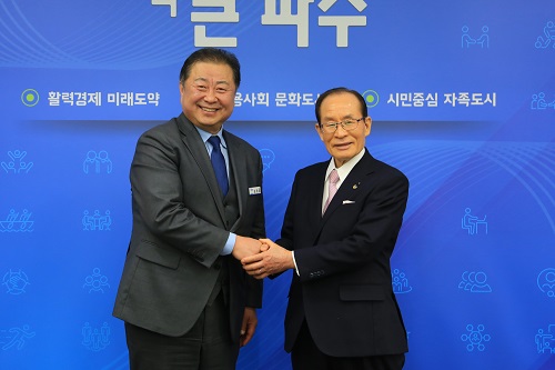 令和5年度に韓国坡州市と交流15周年を迎えることから、交流活性化および友好交流関係を深めるためキム・キョンイル市長を訪れ、記念撮影をする市長