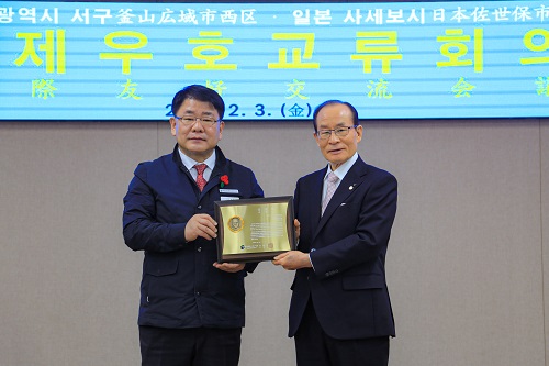 令和5年度に釜山広域市西区と交流10周年を迎えることから、交流活性化および友好交流関係を深めるためコン・ハンス区長庁を訪れ、記念撮影をする市長